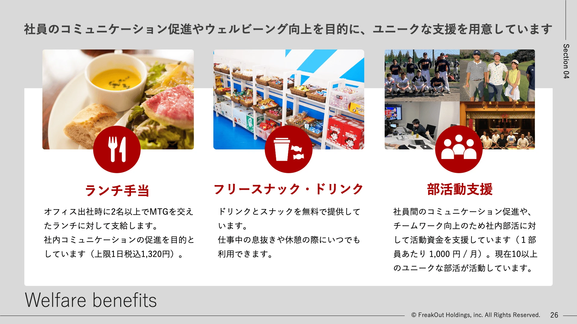 社員 2 名以上でランチミーティングを行う場合は、ランチ代が会社負担※上限ありになります。部門や職種を超えた、社員同士のコミュニケーションの活性化を目的としています。